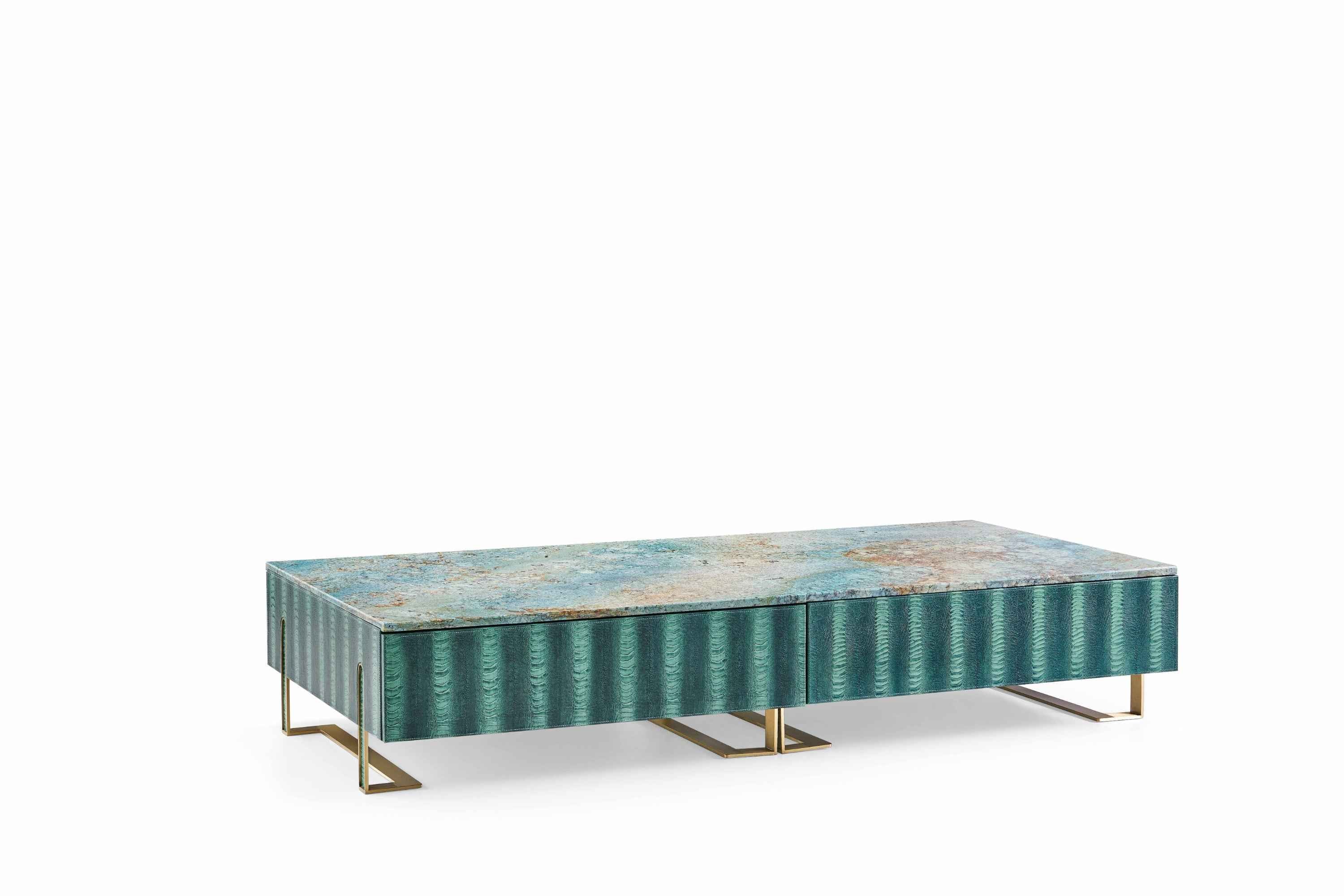 This APTC-2712 Square Coffee Table is perfect for living rooms, offering a durable and chic addition to your home. Featuring a luxurious ostrich leather texture and a stunning emerald green stone top, its stainless steel base adds a touch of sophistication with its brass finish.