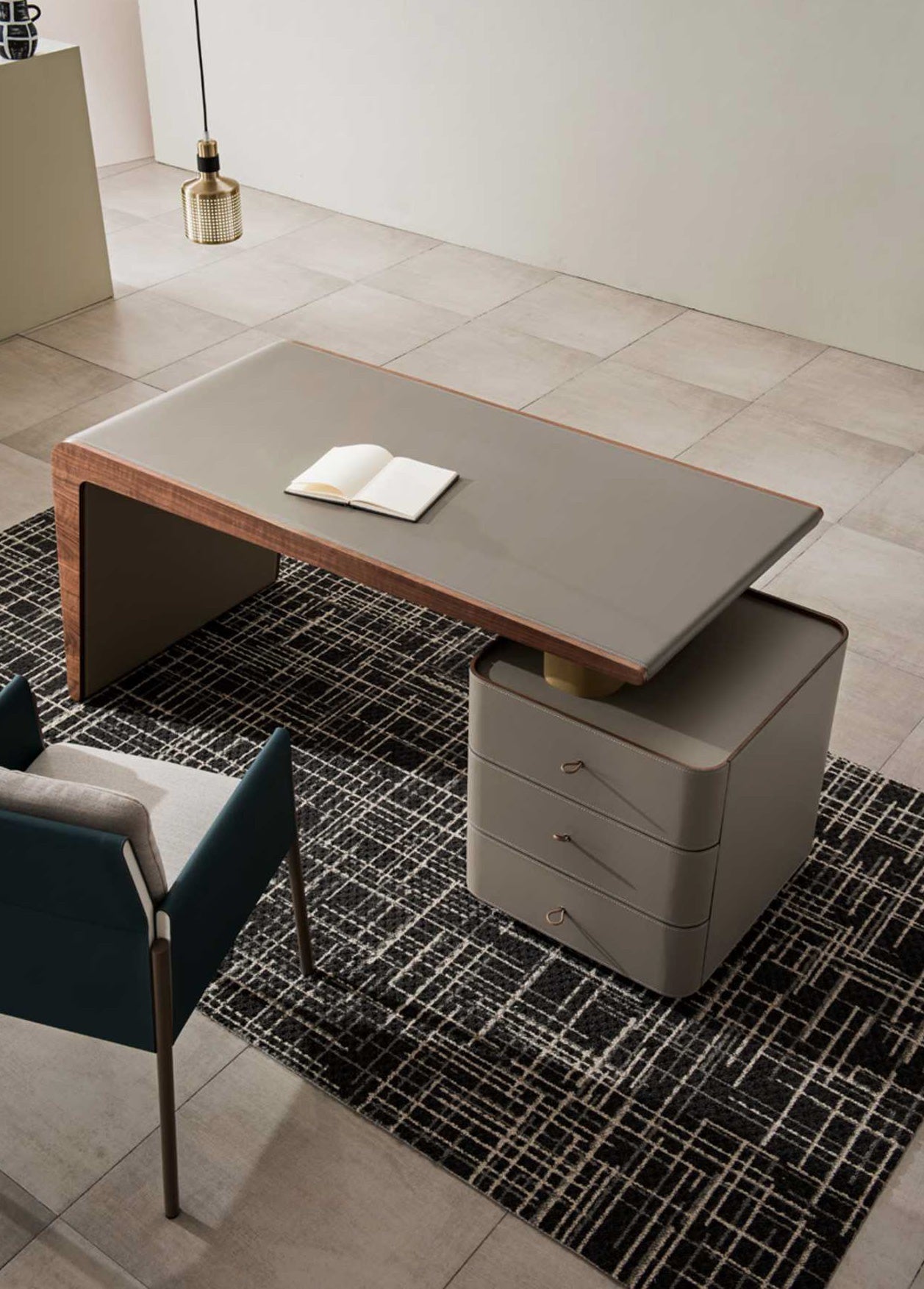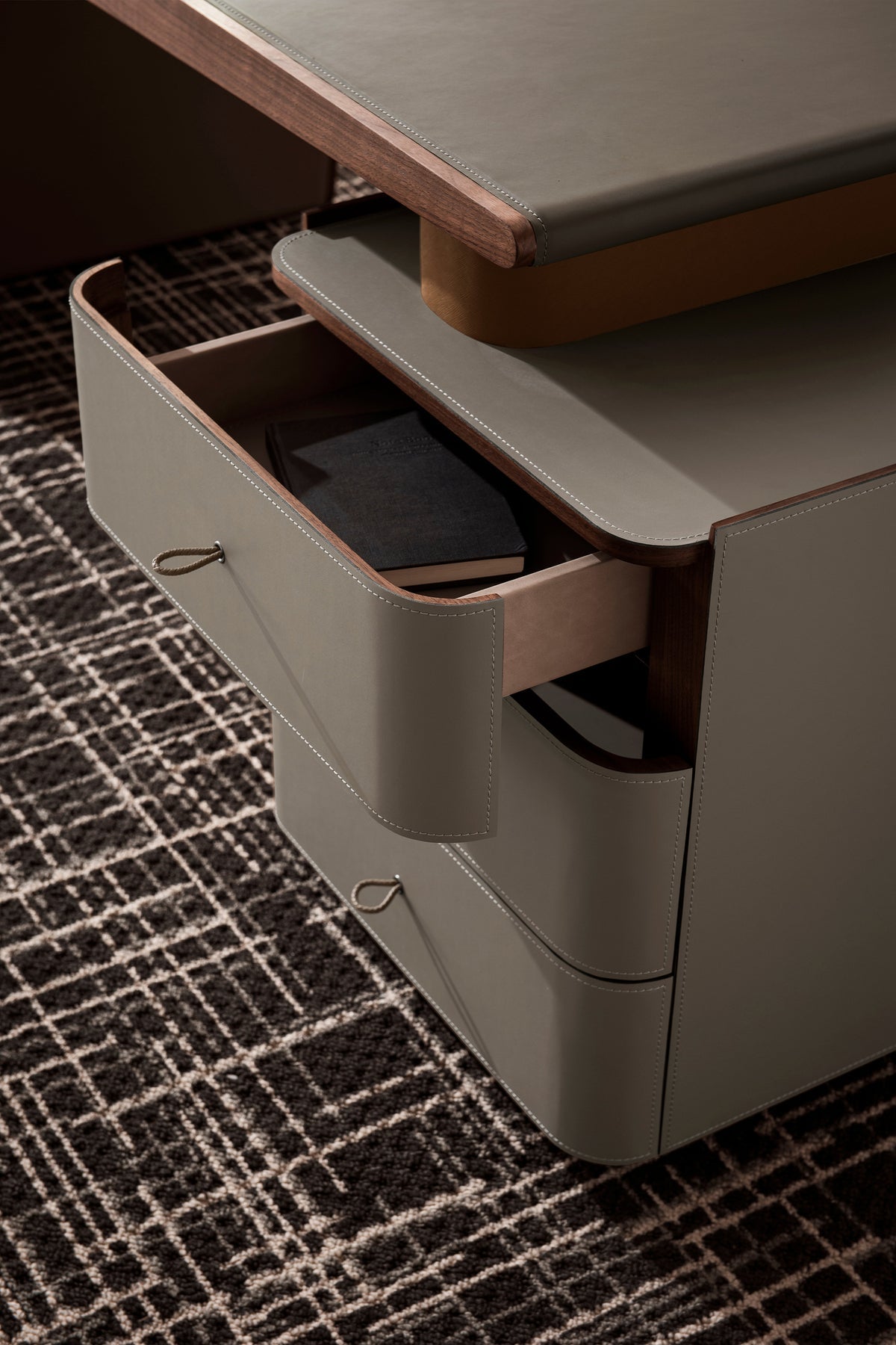 Experience luxury in functionality with our home office table Exquisitely wrapped in saddle leather from top to toe, including a seamlessly integrated three-drawer cabinet on the right. A blend of sophistication and utility, tailored for your workspace.